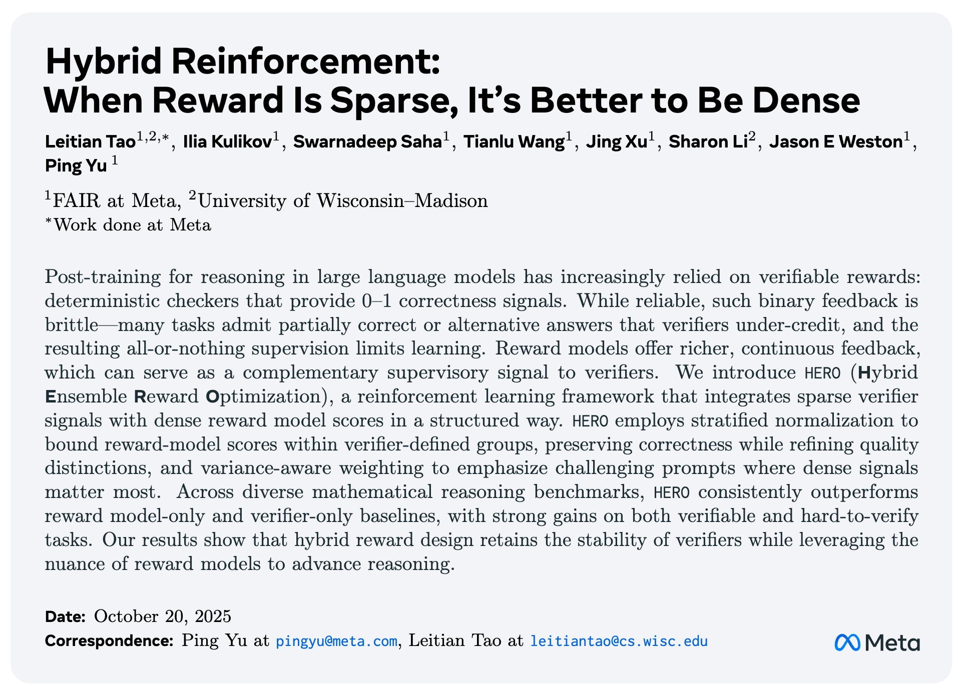 Meta FAIR 推出 HERO:LLM 强化中集成稀疏与密集奖励