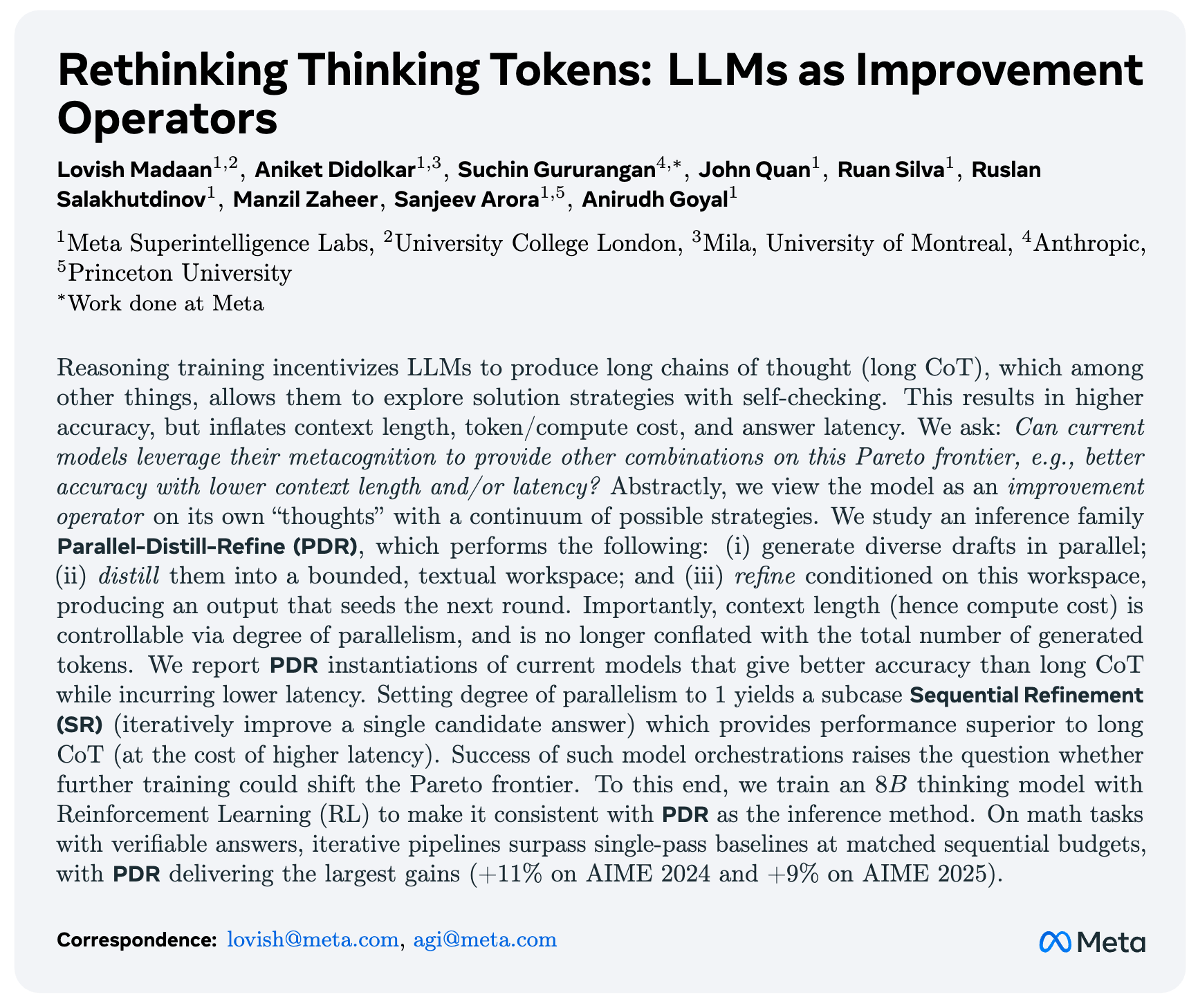 来自 Meta Superintelligence Labs 的论文《Rethinking Thinking Tokens: LLMs as Improvement Operators》,为此提供了一个全新的视角。他们不再将 LLM 简单视为一个单向的“思考者”,而是将其重新定义为一个能够作用于自身“想法”的“改进算子”(Improvement Operator)。基于这一理念,他们提出了一套新的推理框架,旨在通过迭代和并行的策略,打破长链思维的固有束缚,探索推理效率与效果的全新可能性。