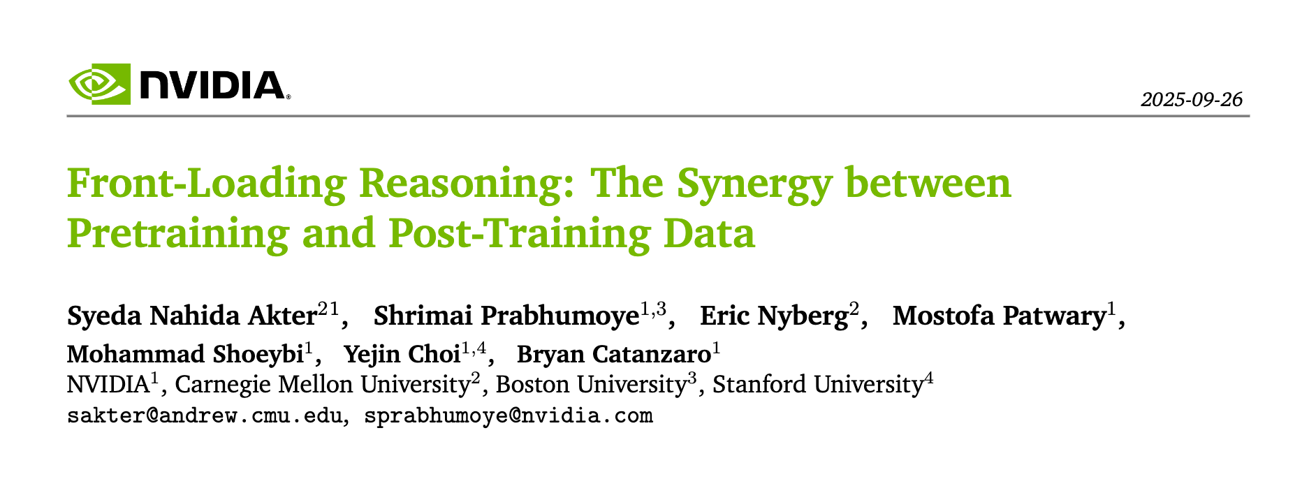 来自 NVIDIA 的论文《Front-Loading Reasoning: The Synergy between Pretraining and Post-Training Data》,对这些问题进行了首次系统性的、大规模的实证研究。他们的工作挑战了传统上将语言建模和推理能力培养相分离的观念,通过一系列精心设计的控制实验,揭示了在整个训练流程中策略性地分配推理数据的深刻影响。这项研究的核心结论是:将推理数据“前置”(Front-Loading)到预训练阶段是至关重要的,它能够为模型建立一个持久的、可复利的基础优势,而这种优势是后期任何强度的SFT都无法完全复制的。