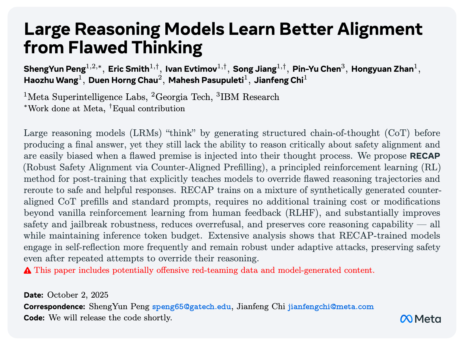来自 Meta 发表的论文《Large Reasoning Models Learn Better Alignment from Flawed Thinking》,为解决这一问题提供了一个创新的视角。他们提出的 RECAP(Robust Safety Alignment via Counter-Aligned Prefilling)方法,其核心思想是:与其期望模型在训练中自发地学会从错误中恢复,不如直接在训练中系统性地让模型暴露于有缺陷的思维链,并显式地教会它如何覆盖(override)这些错误轨迹,并重新路由到安全、有益的回答上。