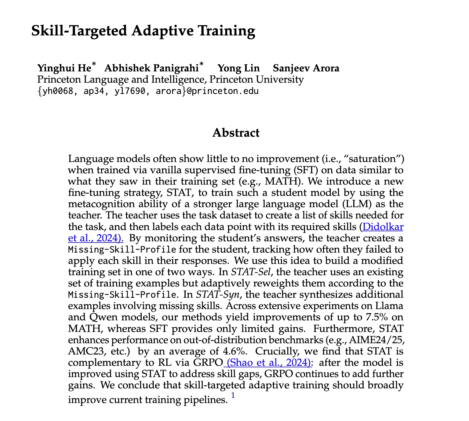 来自普林斯顿大学的研究者们在他们的论文《Skill-Targeted Adaptive Training》中,为解决这一饱和问题提供了一个全新的视角。他们提出的 STAT (Skill-Targeted Adaptive Training) 框架,从根本上将微调范式从“数据驱动”转向了“技能驱动”。STAT 的核心思想借鉴了人类教育学的理念:优秀的教学不是盲目地让学生“刷题”,而是首先诊断出学生知识体系中的薄弱环节(即“缺失的技能”),然后提供针对性的练习来“对症下药”。STAT 将这一理念迁移到 LLM 的训练中,通过一个强大的“教师模型”来诊断“学生模型”在解决问题时所暴露出的技能缺陷,并以此为依据,自适应地构建一个能够高效弥补这些缺陷的训练集。