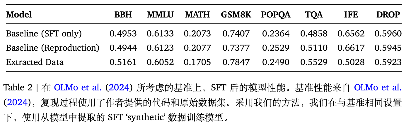 结果如上表所示,用提取出的合成数据训练的模型(Extracted Data),在多个重要基准测试上,取得了与使用原始数据训练的模型(Baseline (SFT only) 和 Baseline (Reproduction))高度可比(comparable)的性能。在某些任务上(如 BBH, GSM8K, TQA),其性能甚至略有超出。