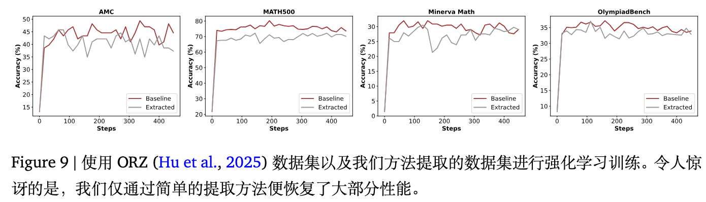 结果如上图所示,在 AMC、MATH500 等多个数学推理基准上,使用提取数据训练出的新模型,其性能曲线与使用原始 RL 数据集训练的基线模型高度重合。这再次证实了“数据蒸馏”风险同样存在于 RL 阶段。