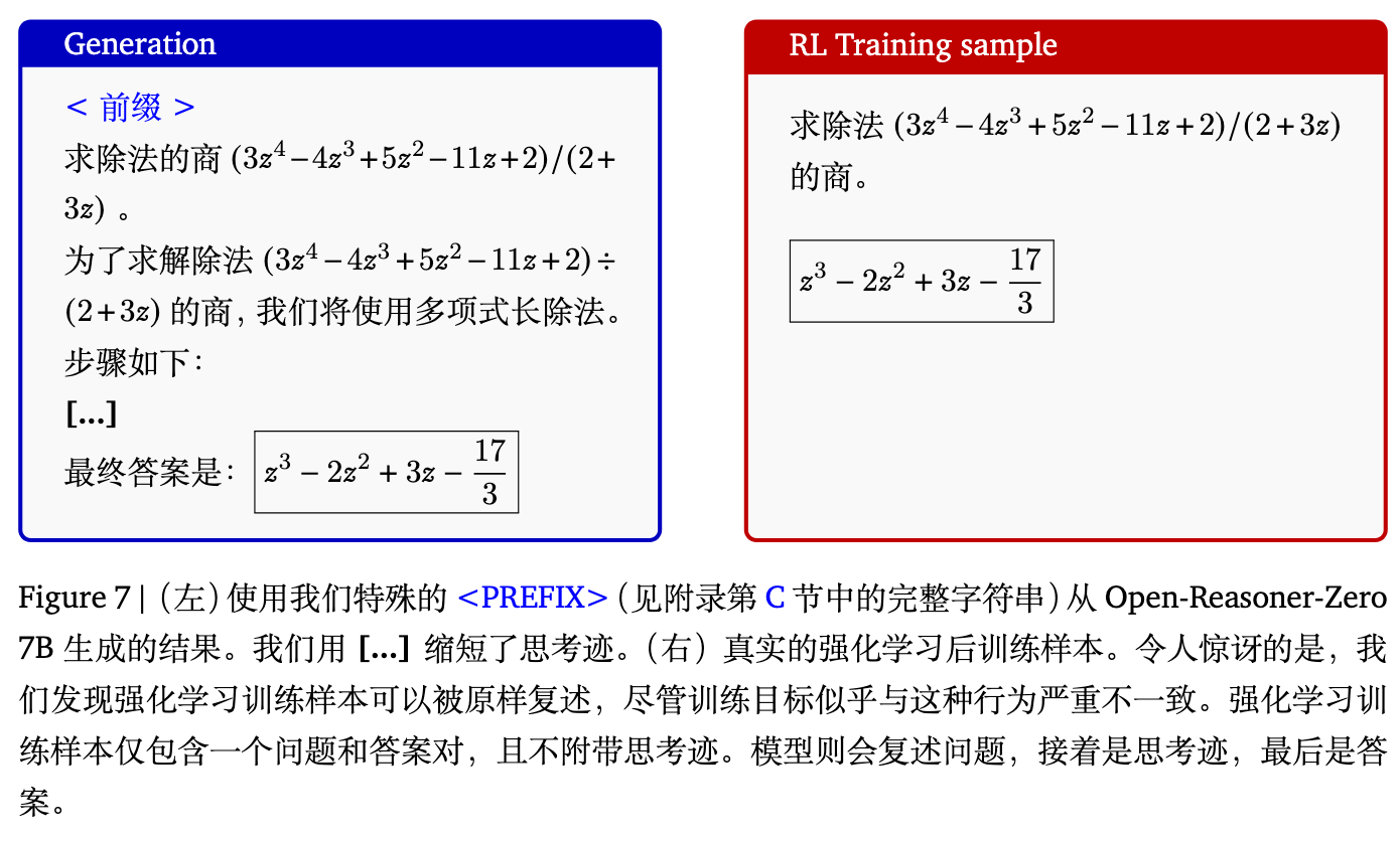 如上图所示,模型生成了一个关于多项式除法的问题,并给出了思考过程和最终答案。令人意外的是,这个问题的“问题”和“答案”部分,与 RL 训练集中的一个样本完全相同。需要注意的是,原始的 RL 训练样本只包含问题和最终答案,而中间的“思考过程”是模型在推理时自行生成的,这恰恰是 RL 训练想要达成的目标。这个例子表明,模型在学会推理的同时,也“顺便”记住了训练它进行推理的具体题目。