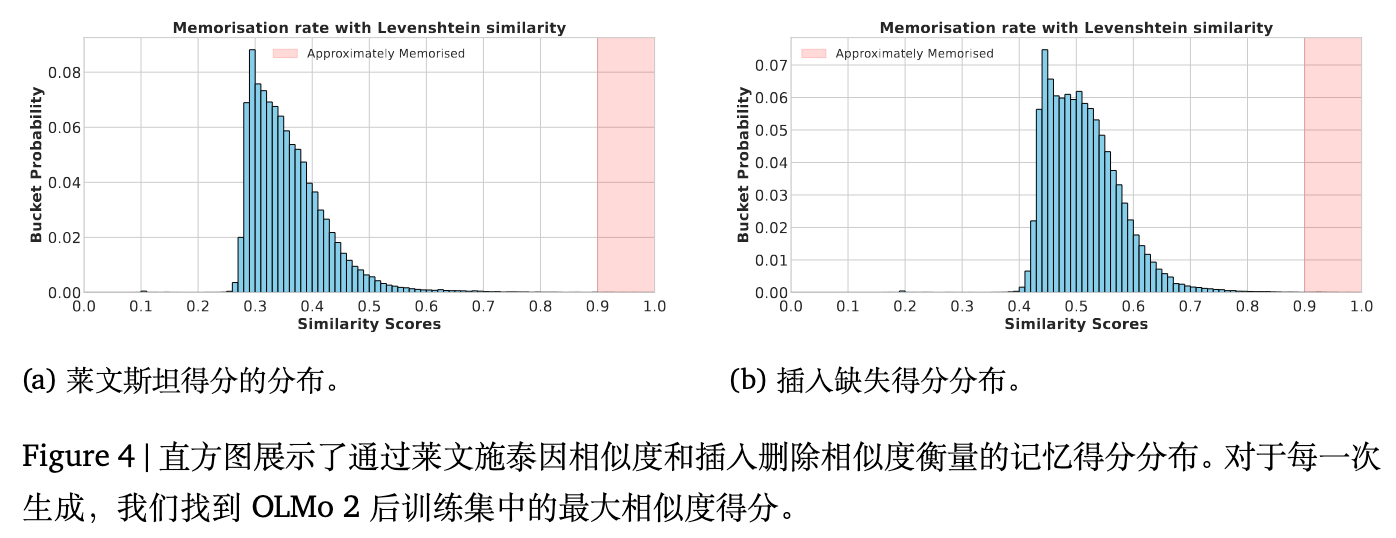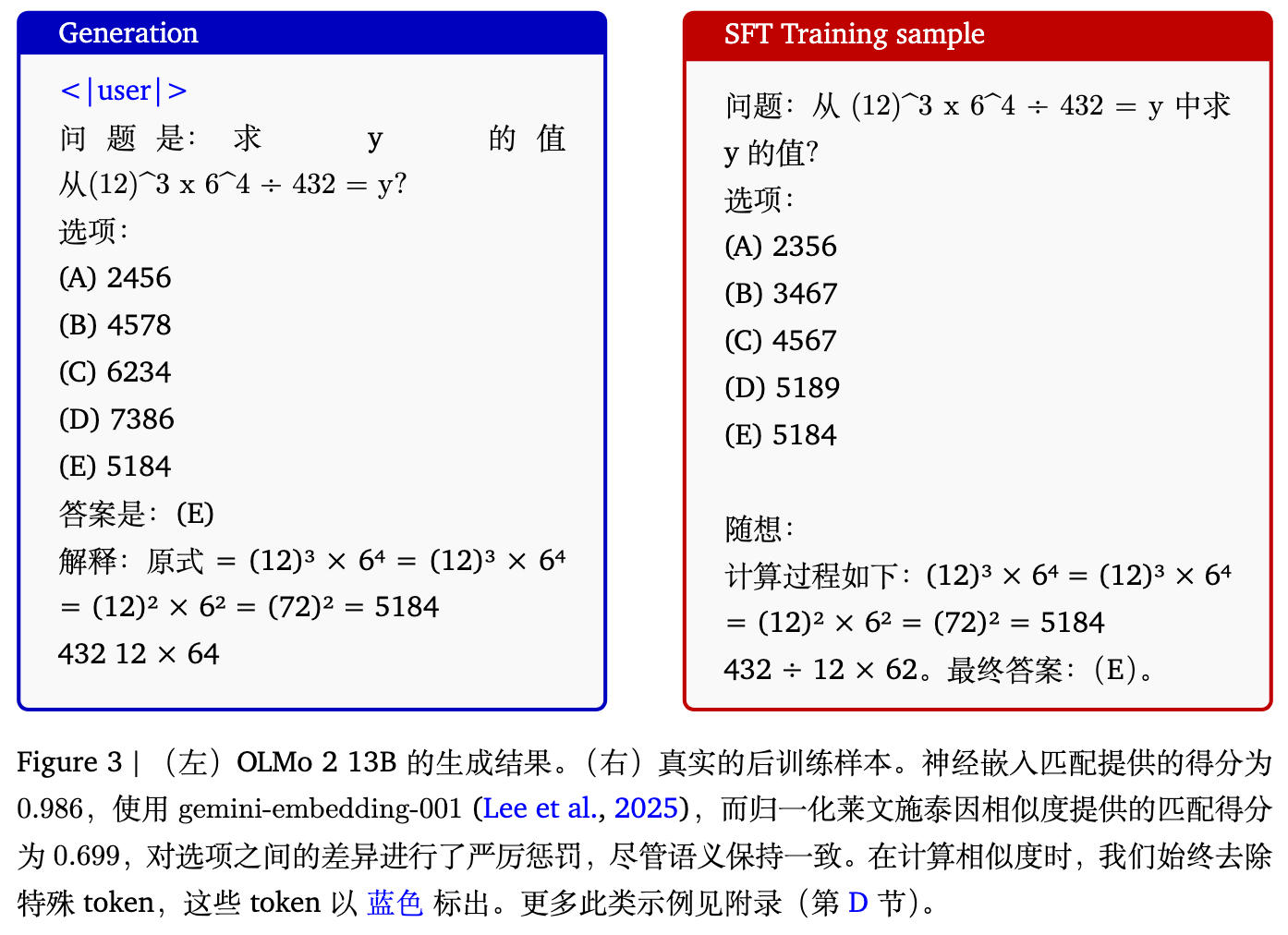 另一个例子(见上图)更直观地展示了这一点。左侧是模型生成的一个数学选择题,右侧是其在 SFT 训练集中的最佳匹配。可以看到,题目本身 (12)^3 * 6^4 / 432 = y? 和最终答案 (E) 5184 是完全一致的。仅仅因为选项 (A) 到 (D) 的“干扰项”数字不同,以及右侧多了一段 "Random thoughts" 的内心独白,基于 Levenshtein 距离的相似度得分就降至约 0.699。这再次说明,字符串匹配对于这种语义等价但表面存在微小差异的情况,会给出惩罚,从而错报、漏报了真实的记忆情况。