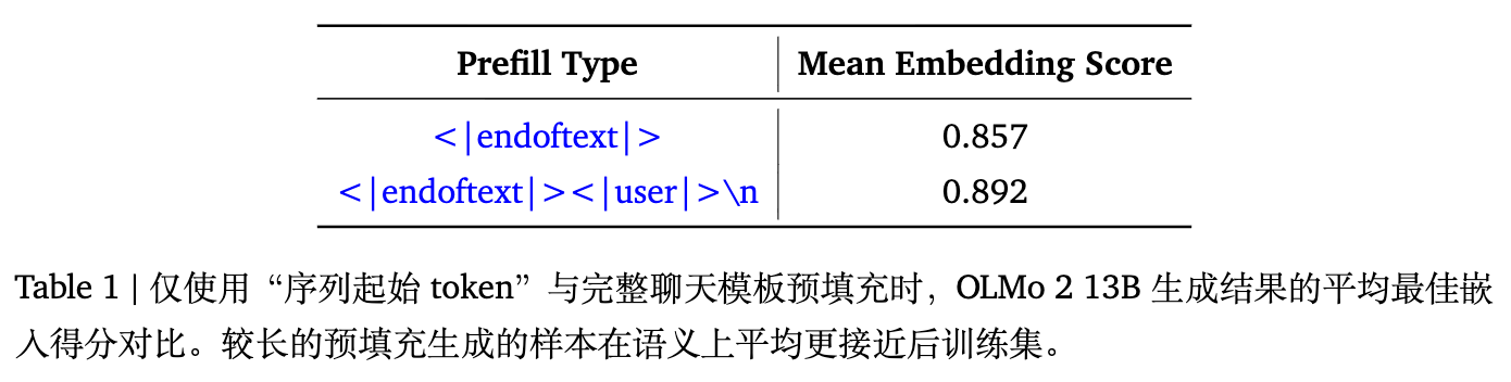 基于这个观察,研究者提出了一个假设:由于聊天模板与后训练阶段的对齐数据紧密关联,那么将这些模板的起始部分作为 prompt 提供给模型,可能会强烈地诱导模型从其后训练数据的分布中进行采样。换言之,当模型看到 <|endoftext|><|user|>\n 这样的前缀时,它会“联想”起自己在 SFT 阶段见过的无数个类似格式的样本,从而倾向于生成一个结构和内容都与对齐数据相似的输出。