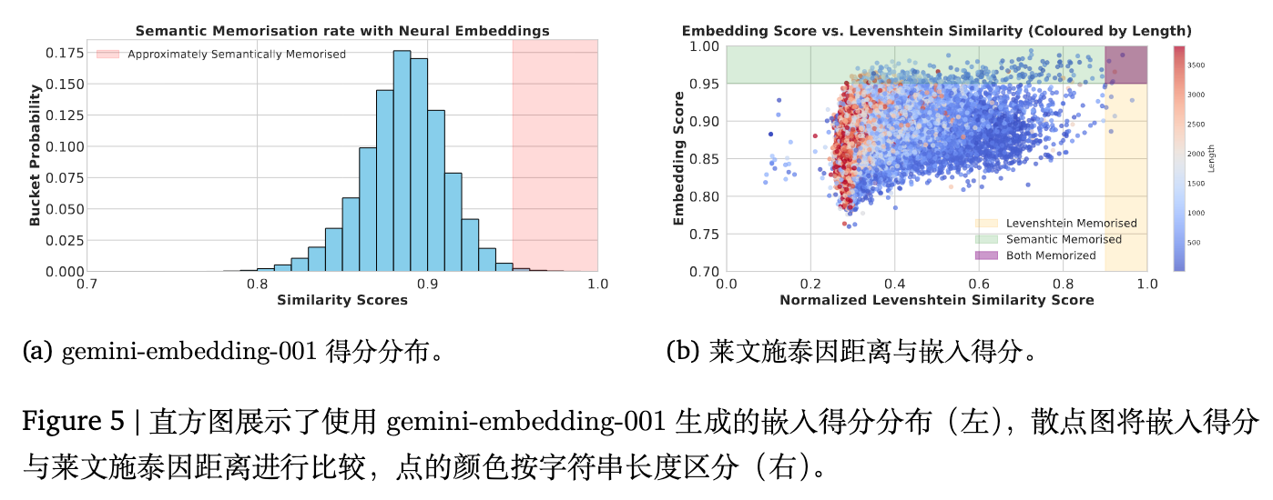两种度量的弱相关性:上图右侧的散点图进一步揭示了问题所在。图中每个点代表一个生成样本,其 x 轴是 Levenshtein 分数,y 轴是嵌入分数。可以看出,两者之间没有强烈的线性关系。大量样本的 Levenshtein 分数很低(x 轴靠左),但嵌入分数却很高(y 轴靠上),这些点就是被字符串匹配所“漏掉”的真实记忆实例。图中的颜色还表示了序列长度,可以看出,对于较长的序列,Levenshtein 分数倾向于更低,这说明字符串匹配在处理长文本的语义等价性上更加无力。