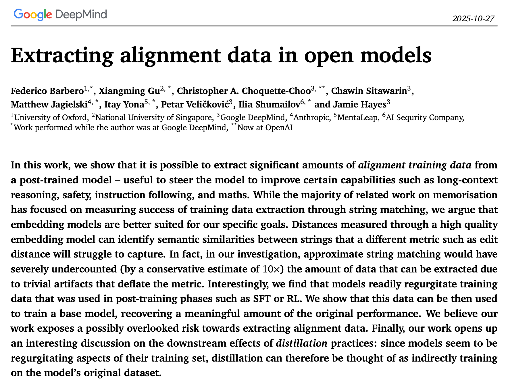 这就构成了一个关键的研究空白:当前的记忆泄露评估体系,是否足以衡量模型对齐“秘方”的泄露程度?如果一个模型 regurgitate(反刍)出的内容,在字面上与原始对齐数据样本不同,但在语义、结构和求解问题的模式上几乎等价,我们应该如何看待这种现象?更进一步,如果竞争对手能够利用这种语义层面的泄露,从一个开放模型中“提取”出其核心对齐数据,并用于训练自己的模型,这将对原始开发者构成怎样的挑战?模型蒸馏(Model Distillation)这一普遍实践,是否在无意中扮演了这种对齐数据泄露的催化剂?