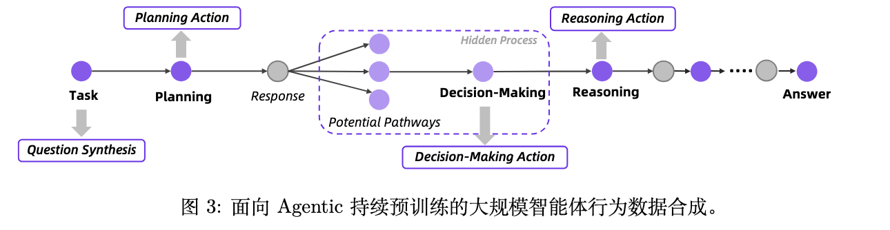 大规模智能体行为数据合成:为了支持 CPT,作者围绕智能体工作流的完整生命周期合成数据,如下图所示。