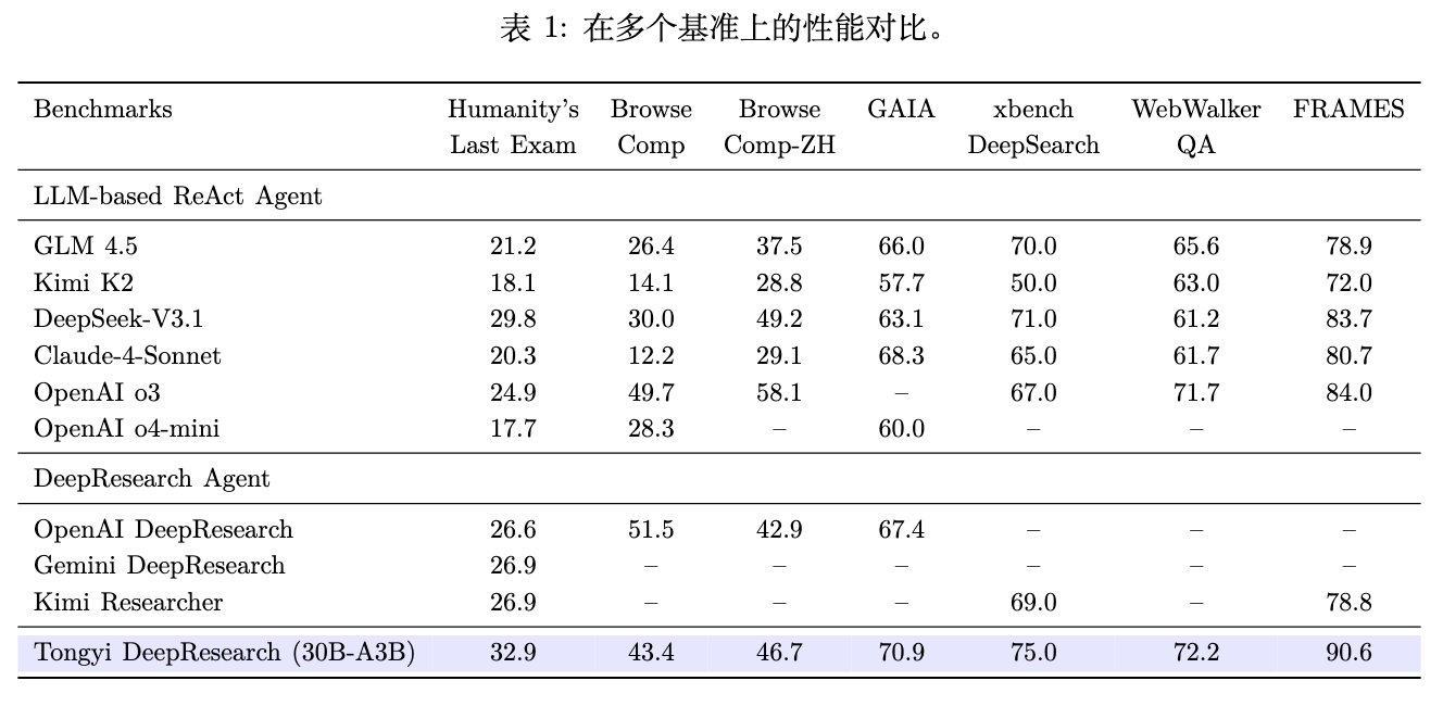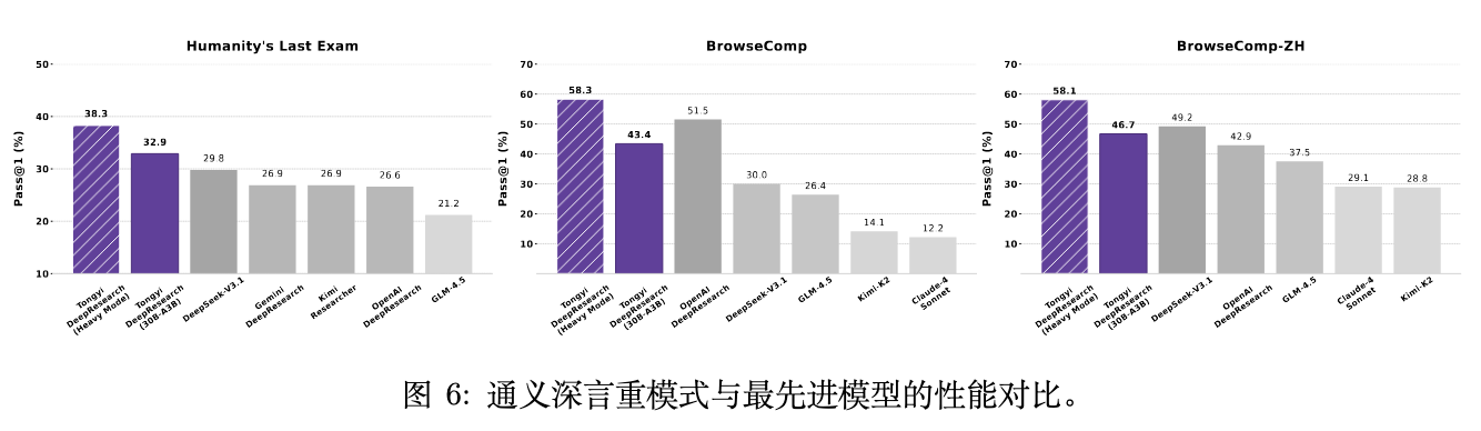 实验结果显示,通义 DeepResearch 在几乎所有评估的基准上都取得了最高的得分,展现了在英文和中文任务上的泛化能力。它在性能上超过了包括 OpenAI o3 和 DeepSeek-V3.1 在内的开源和闭源商业系统。值得注意的是,这些性能是在每个 token 仅激活 3.3B 参数的条件下实现的,突显了模型的效率和可扩展性。总体而言,通义 DeepResearch 为开源深度研究智能体设立了一个新的性能水平。