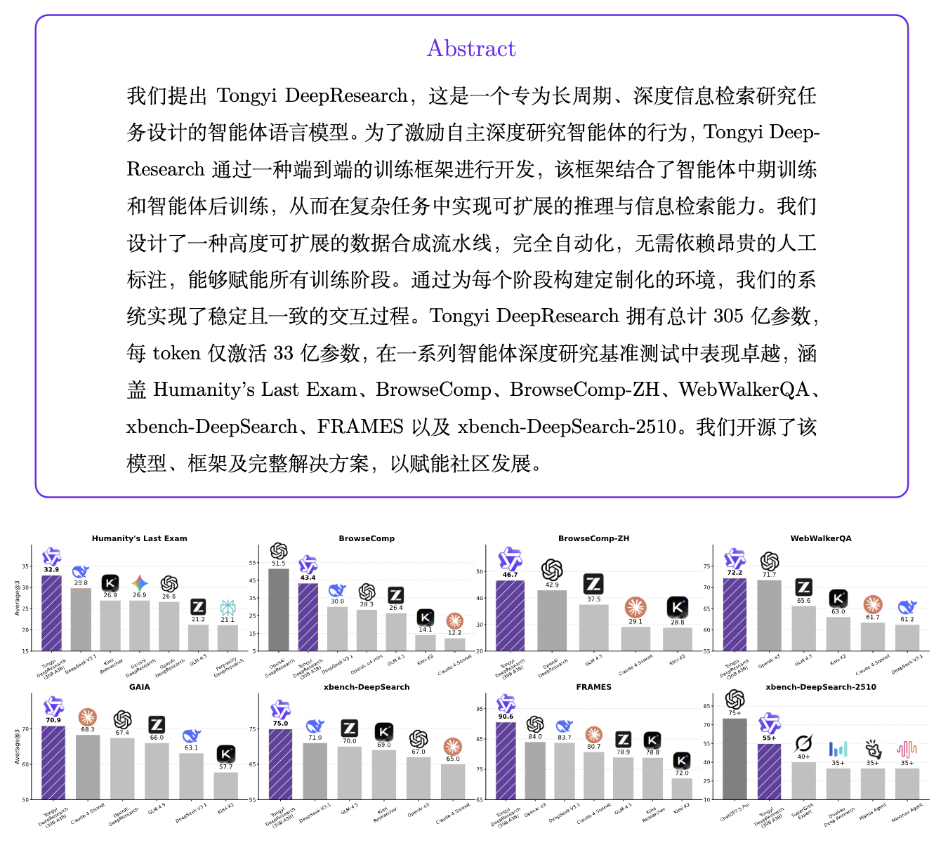通义 DeepResearch 是一个旨在赋予大语言模型自主研究能力的智能体。其目标是让模型能够像人类研究员一样,围绕一个复杂问题,自主地进行规划、搜索、推理和知识合成。该项工作的核心贡献可以概括为以下三点:
