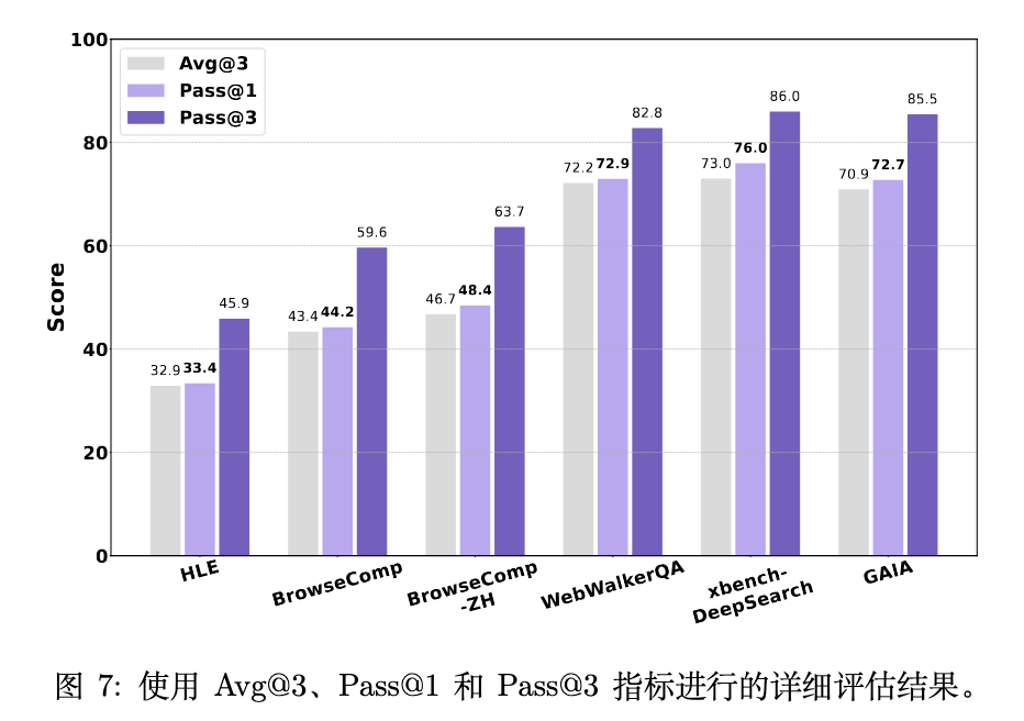 评估参数:为保证稳定性和可复现性,采用了固定的推理参数(temperature=0.85, repetition penalty=1.1, top-p=0.95),每个任务最多允许 128 次工具调用,上下文长度限制为 128K。每个基准独立评估三次,报告平均性能(Avg@3)。
