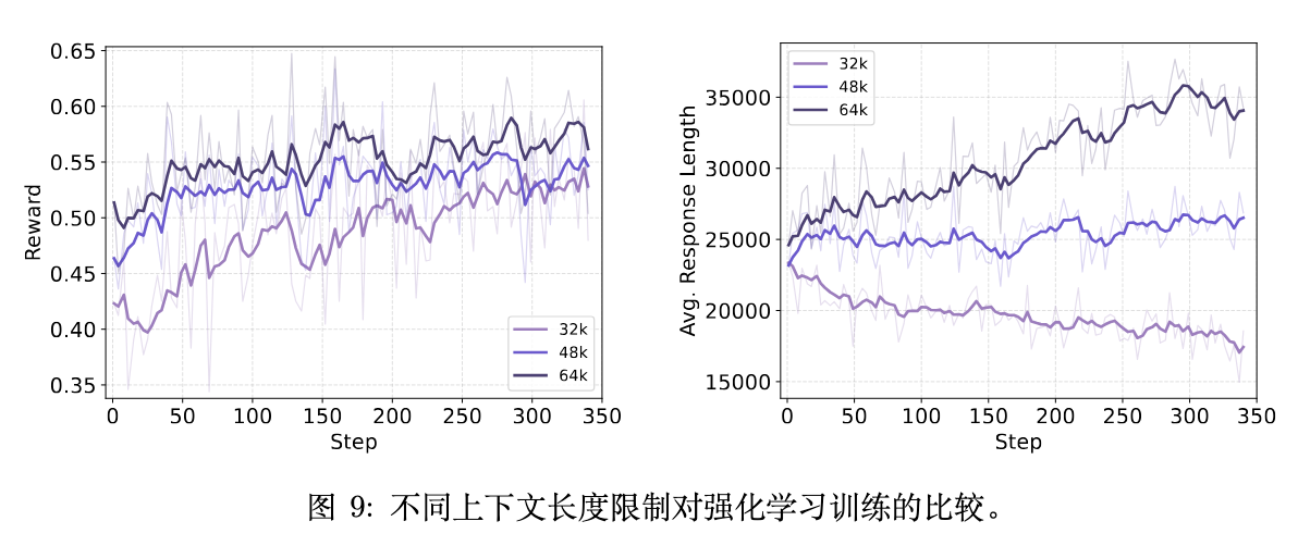 RL 的上下文长度:作者分析了 32k, 48k, 和 64k 上下文限制对 RL 训练过程的影响。如下图左侧所示,所有三个模型都表现出稳定有效的策略学习,但性能上限不同,这符合预期。一个更有趣的发现出现在下图右侧的平均响应长度上。64k 模型学会了利用其扩展的上下文来构建更详尽的解决方案。而 32k 模型的响应长度呈现出明显的下降趋势。这揭示了一个深刻的洞见:对于一个上下文受限的模型,在一个为能力更强的模型设计的课程上进行 RL 训练,可以迫使其发现更高效的解决方案。因为尝试那些最优解超过其上下文长度的问题很可能会得到零奖励,这为模型创造了一个强大的隐式激励,去发现更简洁、更有效的行动序列。
