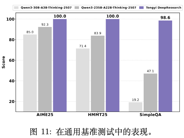 通用基准性能:在三个通用基准 AIME25, HMMT25 和 SimpleQA 上的评估结果表明,通义 DeepResearch 相比仅依赖推理而无工具使用的基础模型有显著提升。这得益于搜索能力和 Python 解释器的原生计算支持。