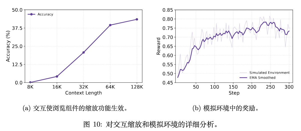 交互轮次扩展:下图 (a) 展示了 BrowseComp 数据集上的扩展曲线,随着上下文长度和交互次数的增加,模型的性能持续提升。 -