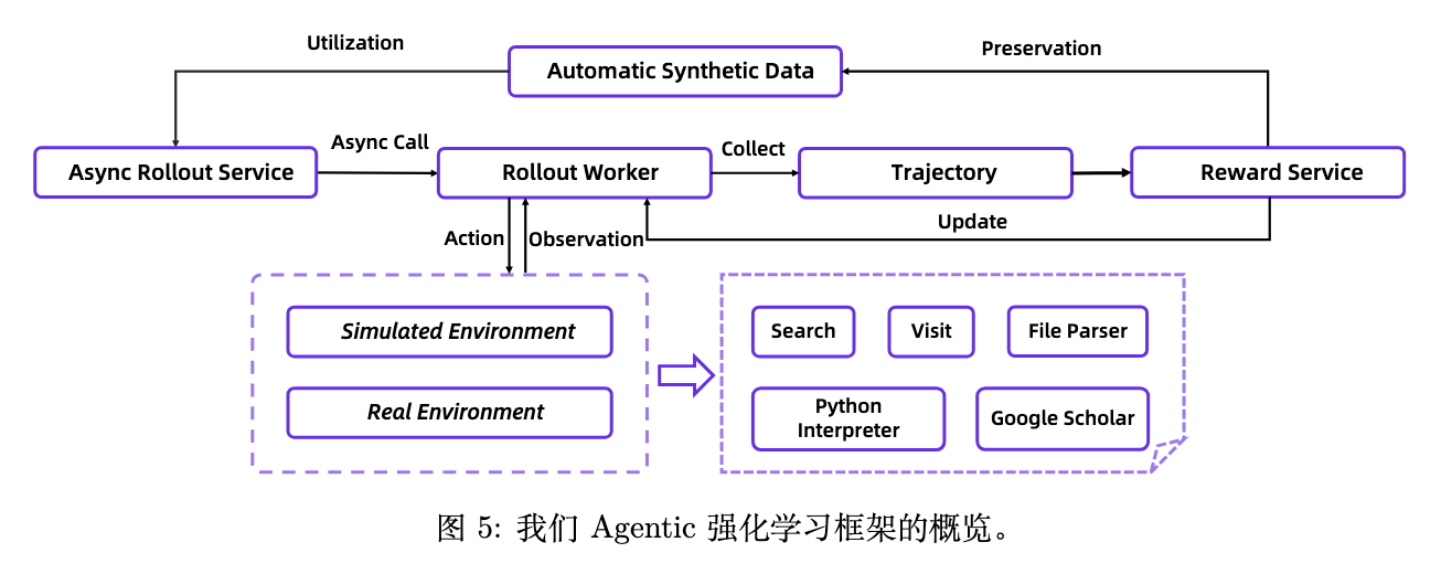 真实世界环境:集成了多个专用工具,包括搜索(Search)、访问网页(Visit)、Python 解释器(Python Interpreter)、谷歌学术(Google Scholar)和文件解析器(File Parser)。为了保证训练的稳定性,他们开发了一个统一的沙箱,对所有工具调用进行集中调度和管理,实施了包括 QPS 速率限制、结果缓存、自动超时重试、服务降级和备份 API 无缝故障切换等机制。 -