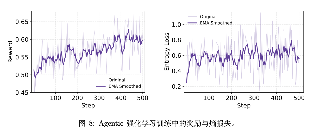 训练配置:该阶段的目标是为模型注入智能体行为的归纳偏置,同时保留其广泛的语言能力。优化目标是标准的下一词元预测(Next-Token Prediction)损失函数。训练分为两个阶段:第一阶段使用 32K 的上下文长度,第二阶段扩展到 128K。在第二阶段,引入了大量的长序列(64K-128K)智能体行为数据,以增强模型进行长时程推理和行动的能力。在两个阶段中,都混入了一小部分通用的预训练数据,以防止模型遗忘其基础泛化能力。