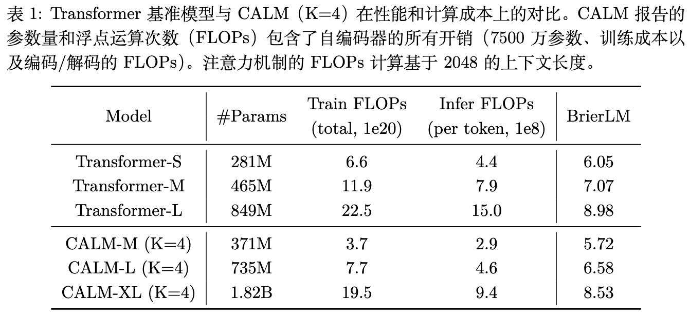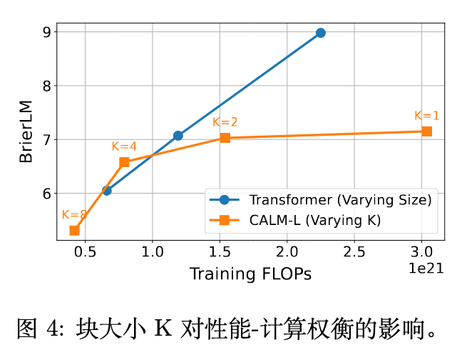 实验结果表 1 表明,CALM 范式建立了一个新的、更高效的性能-计算边界。例如,一个 371M 参数的 CALM-M (K=4) 模型,在 BrierLM 分数上与 281M 参数的 Transformer-S 基线相当,但所需的训练 FLOPs 减少了 44%,推理 FLOPs 减少了 34%。这证实了通过提升语义带宽来换取计算效率的核心假设。