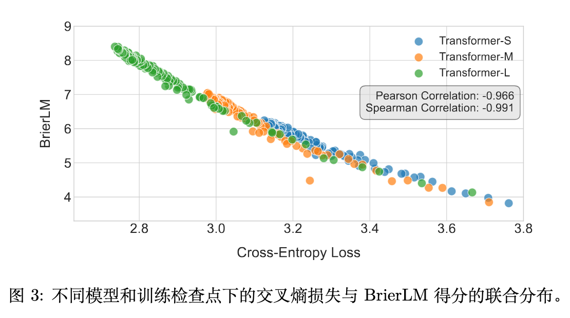 结果显示,BrierLM 与交叉熵损失呈现出高度的负相关性(皮尔逊相关系数为 -0.966,斯皮尔曼等级相关系数为 -0.991)。这种近乎线性的强关联证实了 BrierLM 是一个衡量语言建模能力的可靠指标,可以作为 Perplexity 在无似然场景下的可信替代品。