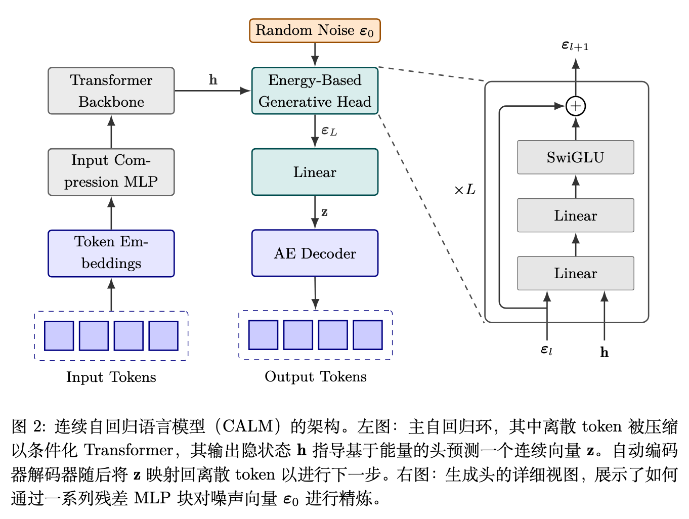 CALM 的整体架构由一个 Transformer 主干网络和一个轻量级的生成头(generative head)组成。Transformer 负责处理历史向量序列 并输出一个条件隐藏状态 。生成头的任务则是根据 来建模并采样出下一个向量 。
