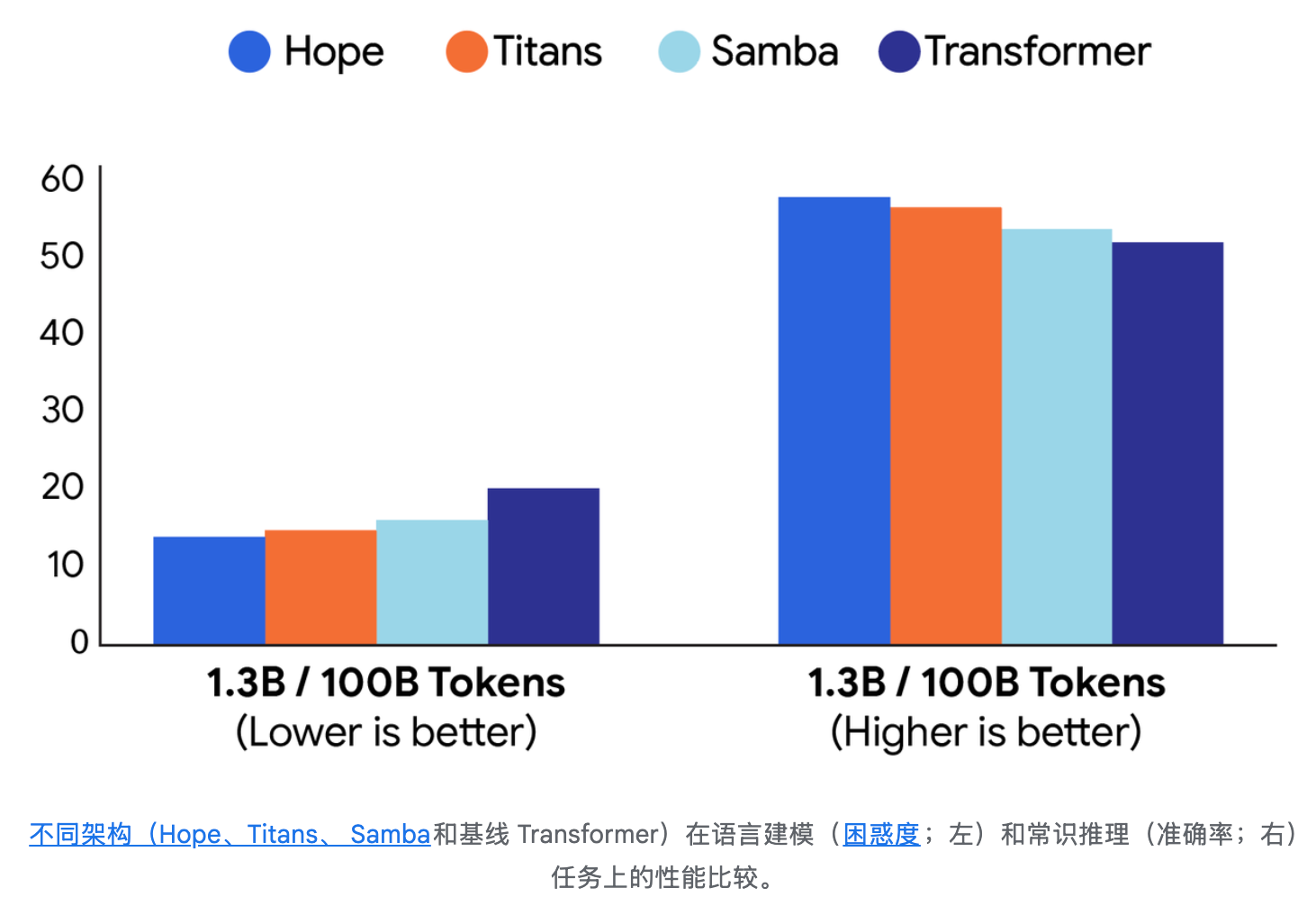 在各种常用且公开的语言建模和常识推理任务中,与现代循环模型和标准Transformer相比,Hope架构表现出更低的困惑度和更高的准确率。