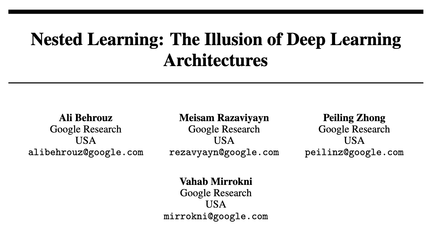 论文标题:Nested Learning: The Illusion of Deep Learning Architectures -