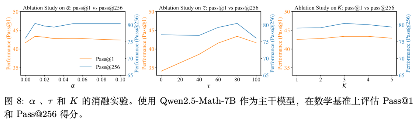 平滑系数 的影响:随着 从 0(等价于 GRPO)增加,pass@256 性能单调提升。这证实了对正向梯度进行平滑是提升探索的关键。 -