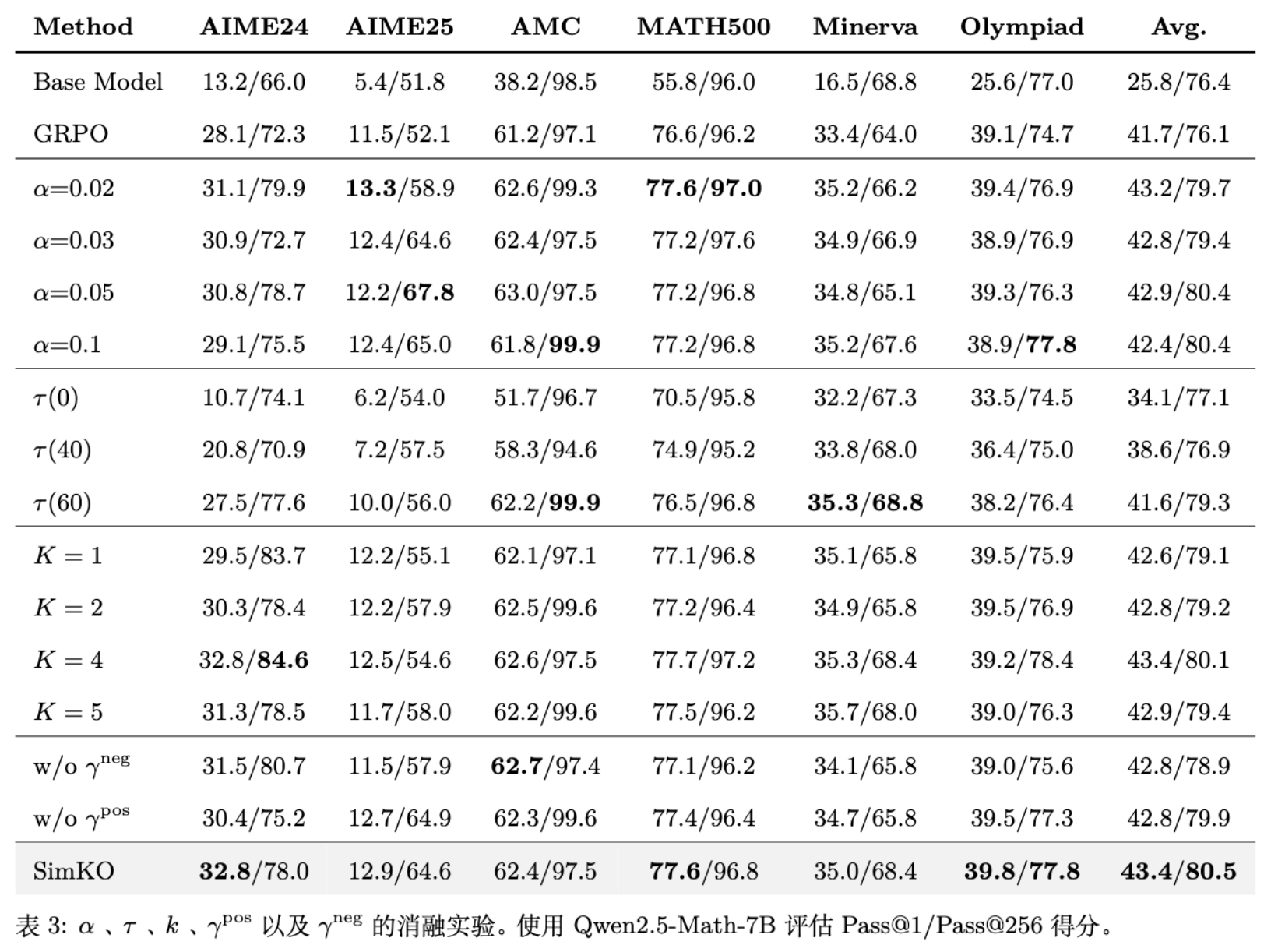 这些结果表明,单纯依赖负样本不足以在挑战性任务上提升 pass@K 性能。SimKO 通过其非对称的梯度调整策略,展现了强大的泛化能力和在困难任务上的有效性。