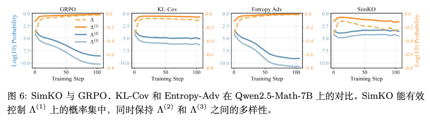 这表明 SimKO 成功地维持了 top-k 候选者之间的概率多样性,为模型的探索行为保留了潜力。