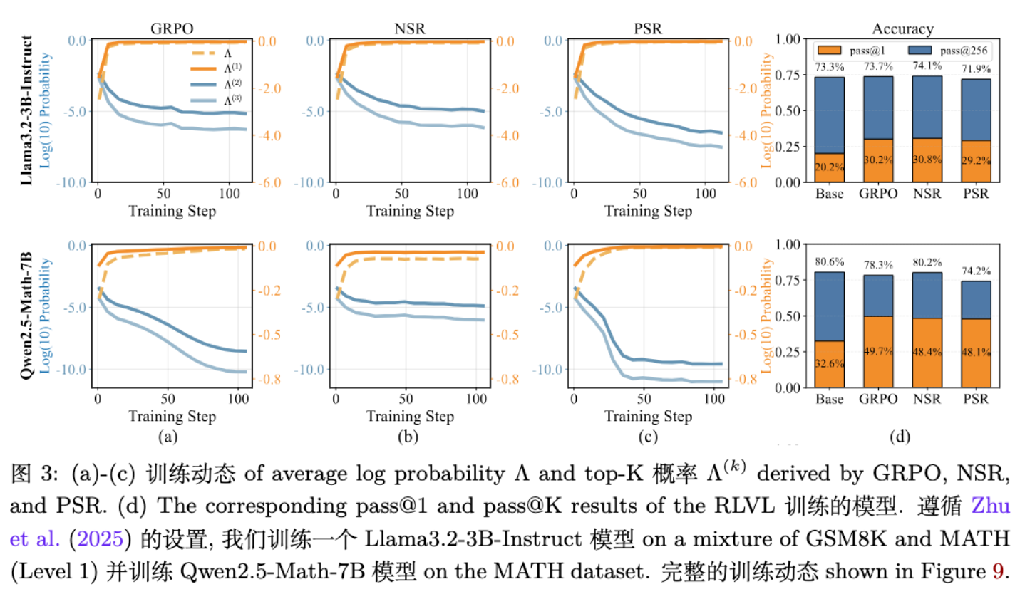 通过对不同模型(如 Llama3.2-3B, Qwen2.5-Math-7B)的训练过程进行追踪,作者发现了一个清晰且一致的模式(图3a-c):