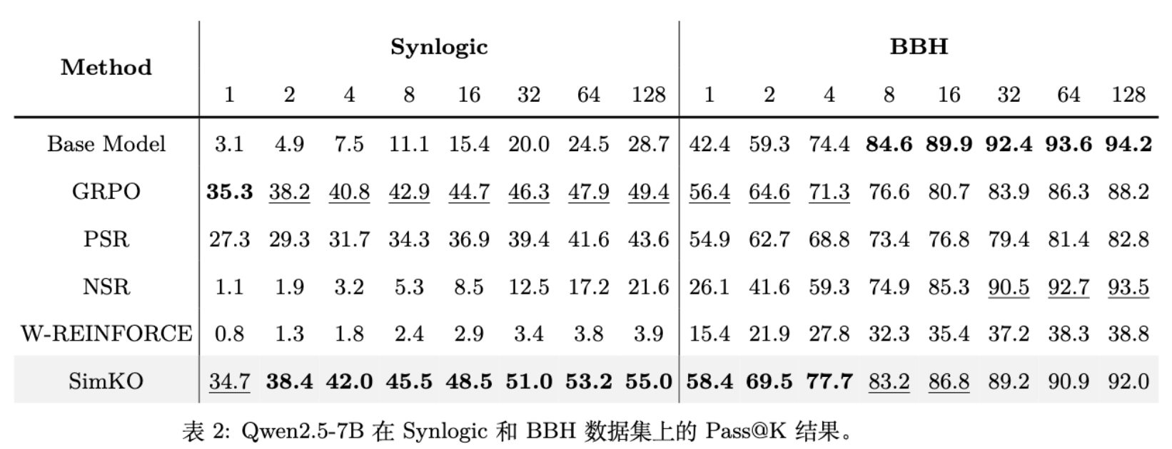 BBH (Out-of-distribution) :在这个任务上,SimKO 同样表现出色,将基础模型的 pass@1 从 42.4% 提升到 58.4%,并且在高 K 值时保持了性能的稳定性。相比之下,GRPO 和 PSR 的性能在 K 值增大时出现了明显下滑。