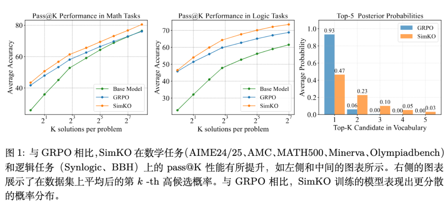 这张图清晰地揭示了三个关键信息。首先,在左侧和中间的 Pass@K 性能图中,SimKO 在数学和逻辑推理任务上,于所有 K 值范围内均一致地优于标准的 GRPO 算法,证明了其在提升多样化推理路径生成能力上的有效性。其次,右侧的后验概率分布图揭示了这一性能优势背后的根本原因:与 GRPO 将绝大部分概率质量集中在 Top-1 候选者(蓝色条高达 0.93)不同,SimKO 采用的策略使得概率分布更为平缓,在降低 Top-1 概率的同时,为 Top-2 至 Top-5 的候选者保留了显著的概率质量。这种“去集中化”的分布形态正是 SimKO 能够鼓励模型进行更广泛探索的关键。这个核心洞察构成了 SimKO 算法的设计基础,我们将在下文详细阐述其具体机制。
