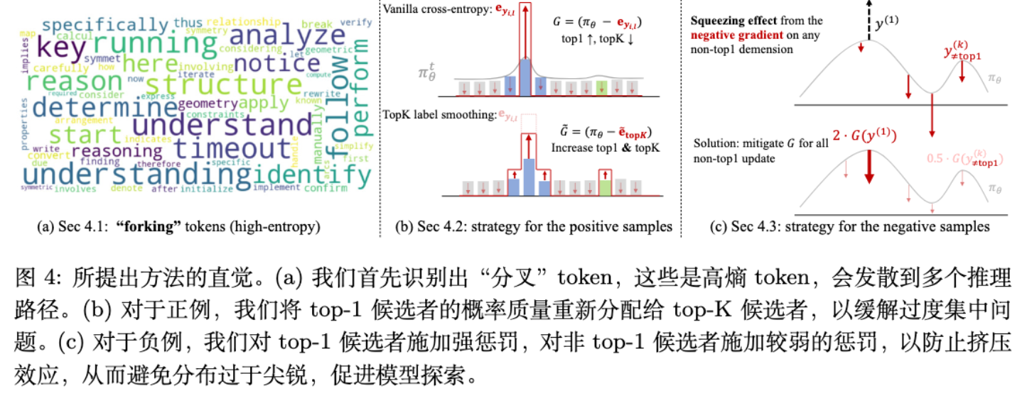 对于来自错误推理路径()的高熵 token,传统的梯度更新会产生一个“挤压效应”(squeezing effect)。当模型试图降低采样到的错误 token 的概率时,它会不成比例地将这部分“释放”出来的概率质量,转移给当前概率最高的 rank-1 候选者。这无意中进一步强化了 rank-1 的主导地位,即便是在一条错误的路径上。(图 4c 负样本的策略)