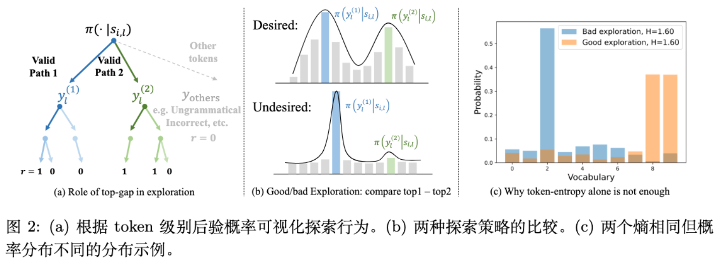 而上图 (c) 则揭示了一个更为深刻的问题:为什么仅仅依赖熵(entropy)这样的宏观指标来衡量探索是不够的。图中展示了两种概率分布,它们的熵值完全相同(H=1.60),但其探索潜力却截然不同。“好的探索”分布(蓝色)将概率主要分配给了少数几个顶尖的候选者,而“坏的探索”分布(橙色)虽然熵值一样,但它将概率高度集中于 top-1,然后将剩余的概率质量分散到大量几乎无关的 token 上。