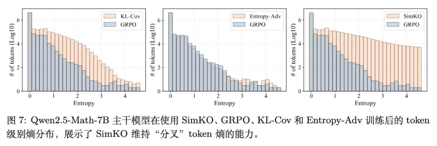 对 token 熵的直方图分析进一步证实了这一点。GRPO 的训练将绝大多数 token 的熵推向了零,而 SimKO 则能够保留大量高熵“分叉” token 的存在,这对于生成多样化的推理路径至关重要。