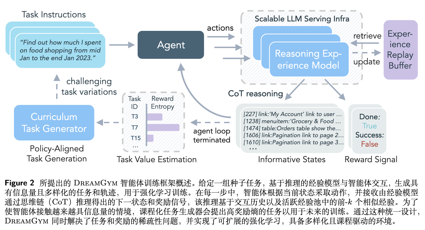 近期,Meta Superintelligence Labs 在论文《Scaling Agent Learning via Experience Synthesis》中提出了 DREAMGYM 框架,不再完全依赖于昂贵且充满限制的真实环境交互,而是转向通过一个基于推理的经验模型来“合成”多样化的经验(Experience Synthesis)。这种方法旨在创建一个可扩展、可控且信息丰富的虚拟训练场,从而为通用强化学习提供一种高效的“热启动”策略。
