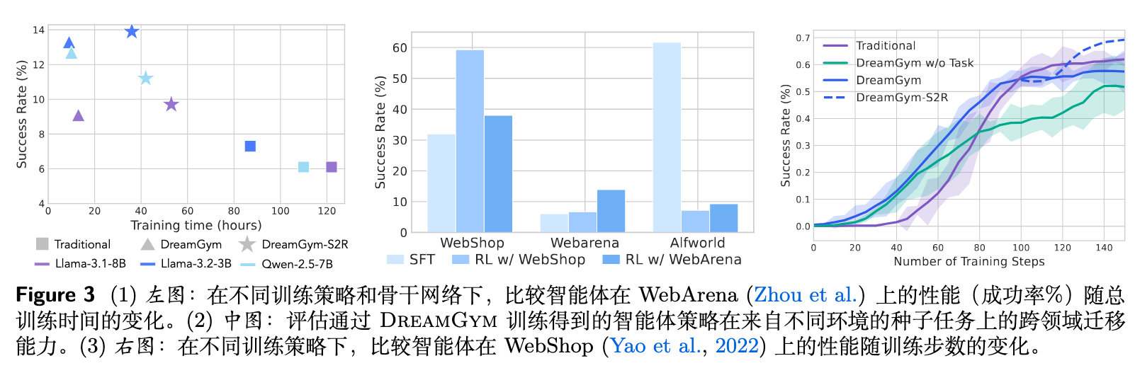 在 Non-RL-Ready 环境中取得突破:在 WebArena 环境中,传统的 RL 方法(Traditional GRPO/PPO)由于环境限制,性能很差甚至难以运行。相比之下,完全在合成环境中训练的 DREAMGYM 取得了超过 30% 的成功率提升。这表明 DREAMGYM 不仅仅是真实环境 rollouts 的一个廉价替代品,更是一种使强化学习在原本棘手的领域变得可行的关键机制。