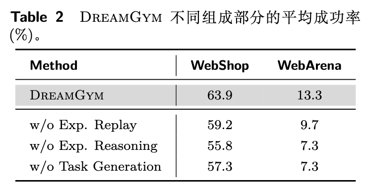 为了验证各个组件的必要性,作者进行了消融实验。表 2 结果显示,移除任务生成器(w/o Task Generation)、经验回放(w/o Exp. Replay)或经验推理(w/o Exp. Reasoning)都会导致性能的显著下降。这证实了自适应课程、历史经验的 grounding 以及基于推理的状态生成,对于框架的整体性能都是不可或缺的。 -