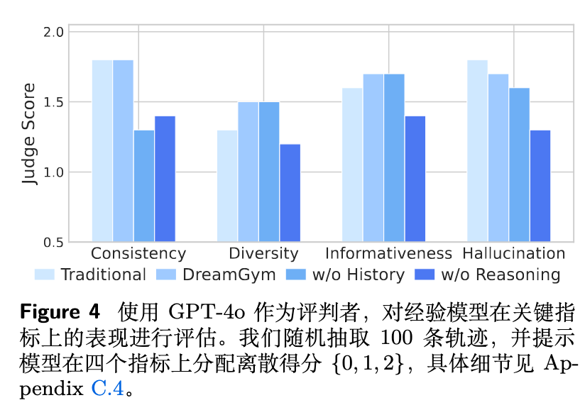 作者使用 GPT-4o 作为裁判,从一致性、多样性、信息性和幻觉四个维度评估了不同变体生成的经验质量。图 4 结果表明,完整的 DREAMGYM 在各项指标上均表现最佳或接近最佳。移除交互历史(w/o History)会严重损害一致性,而移除推理能力(w/o Reasoning)则会降低信息性并增加幻觉。这再次验证了结构化的、基于推理的经验生成方式对于维持轨迹多样性和真实性的重要性。