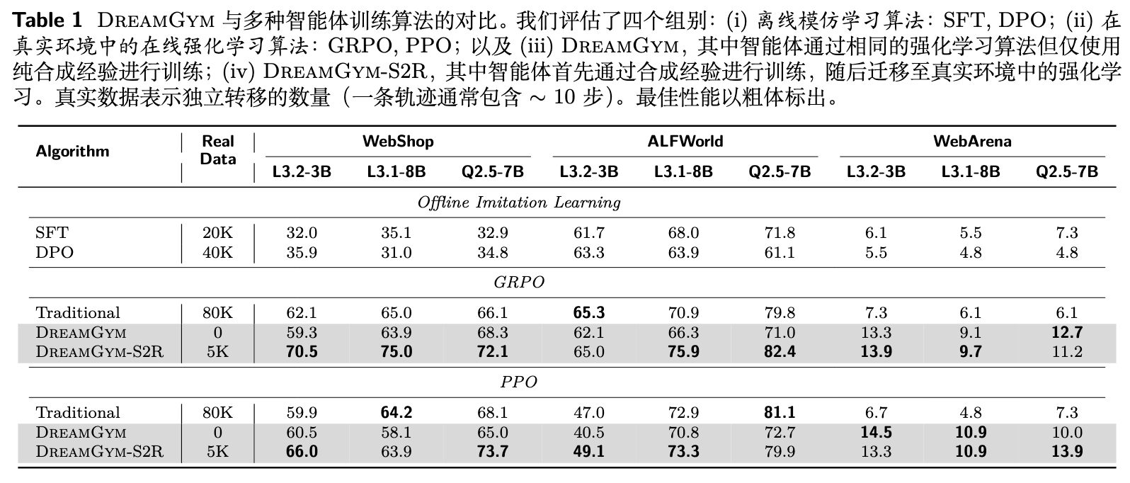 为了验证 DREAMGYM 的有效性和泛化能力,作者在一系列多样化的智能体基准和不同规模的 LLM 主干上进行了全面的实验。