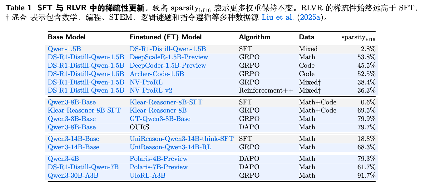 稀疏的参数更新:与高昂的成本形成对比,实证研究发现,经过 RLVR 训练后,模型参数的实际变化量占比很小。相较于 SFT 导致的密集(dense)参数更新,RLVR 的更新呈现出高度的稀疏性(sparsity)。