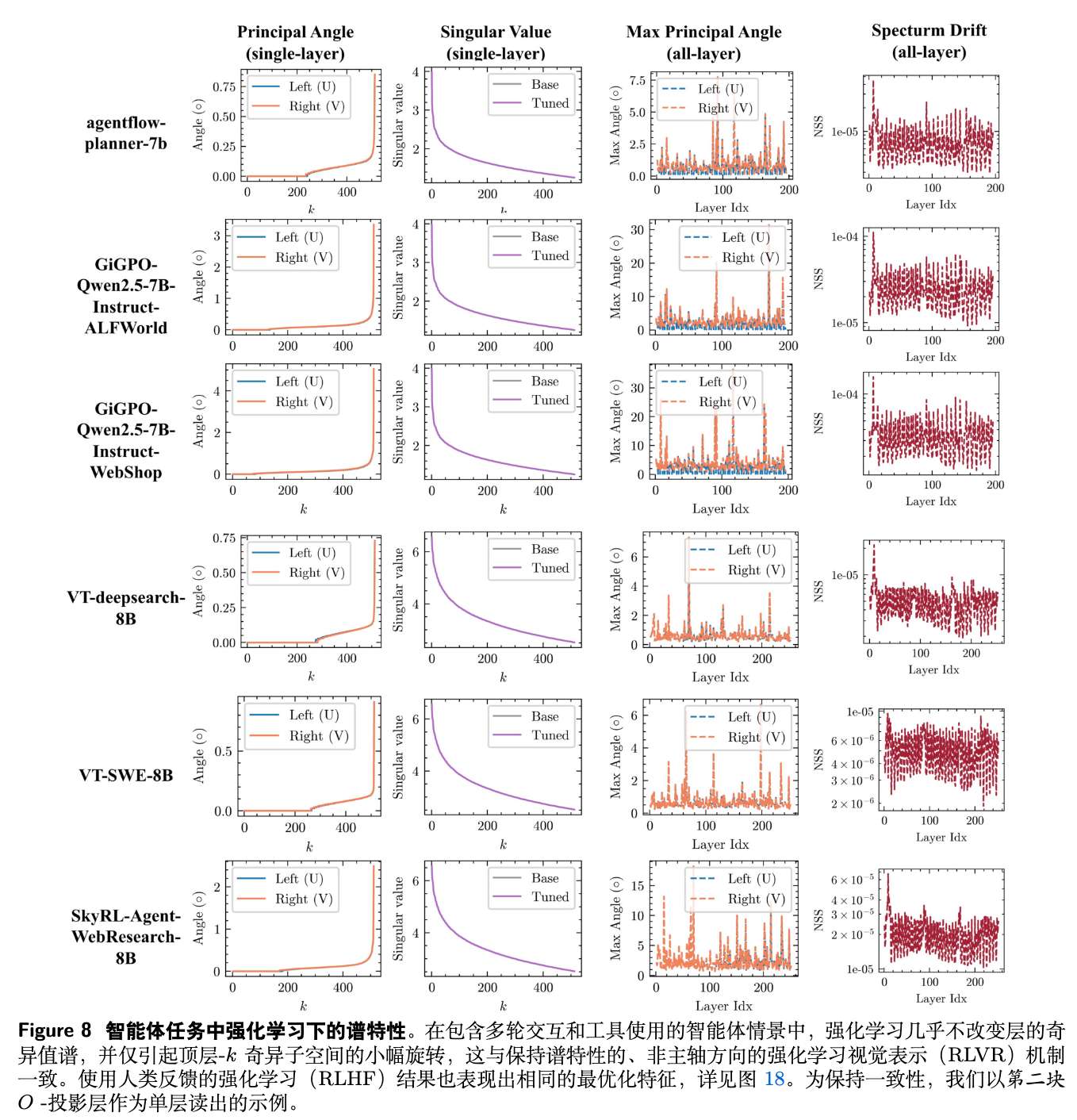 作者对比了在 Qwen3-8B 模型上分别进行 SFT 和 RLVR 训练后,模型各层权重矩阵的谱结构变化。