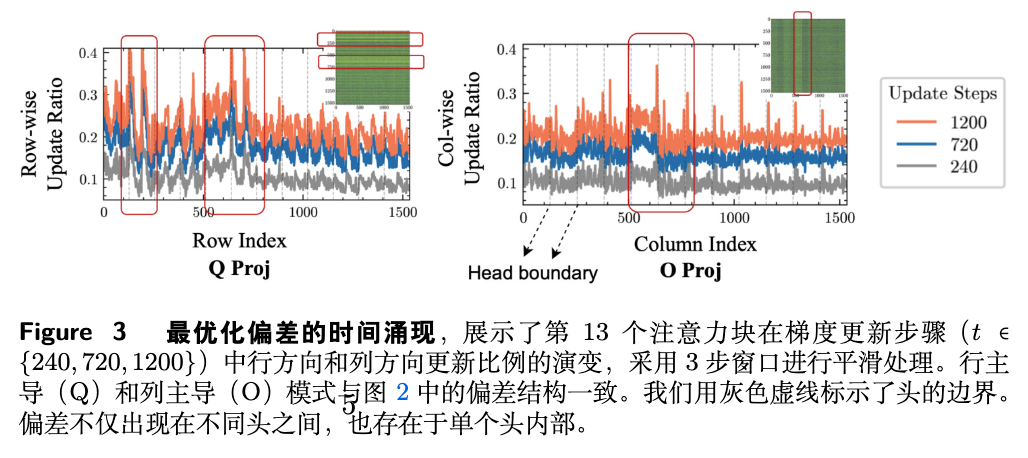 图 3 展示了在第13个注意力块中,按行和按列统计的更新率。可以观察到,更新模式的“峰”和“谷”在训练早期就已经出现,并且随着训练的进行,整体密度虽然增加,但其相对轮廓保持稳定。这表明 优化偏置在训练初期就已确立,并被持续强化,而非一种短暂的瞬态现象。