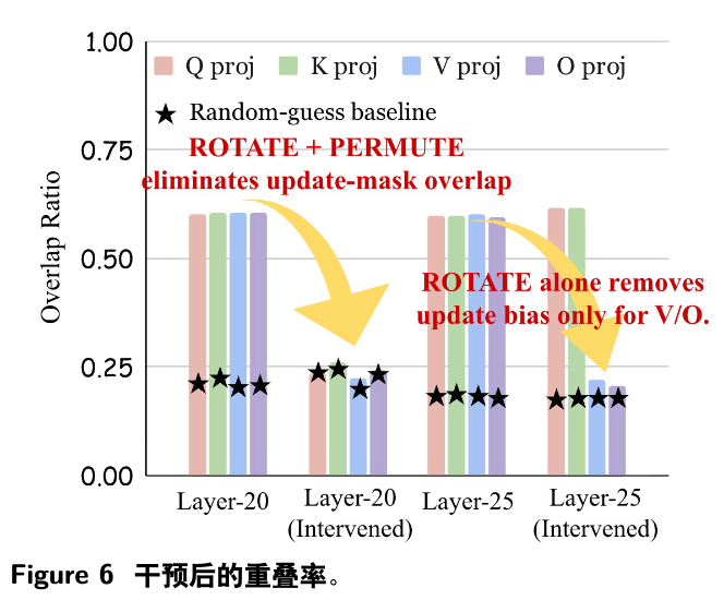 结果如图 6 所示,在未经干预的层,不同运行之间的更新重叠度依然很高。但在被施加了正交旋转的层,更新重叠度骤降至随机水平。这提供了因果证据,证明了 预训练模型的几何结构正是引导优化偏置的根源。一旦几何结构被破坏,引导作用消失,更新模式就退化为随机。