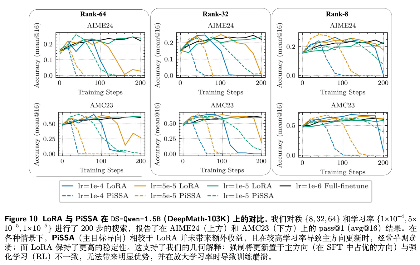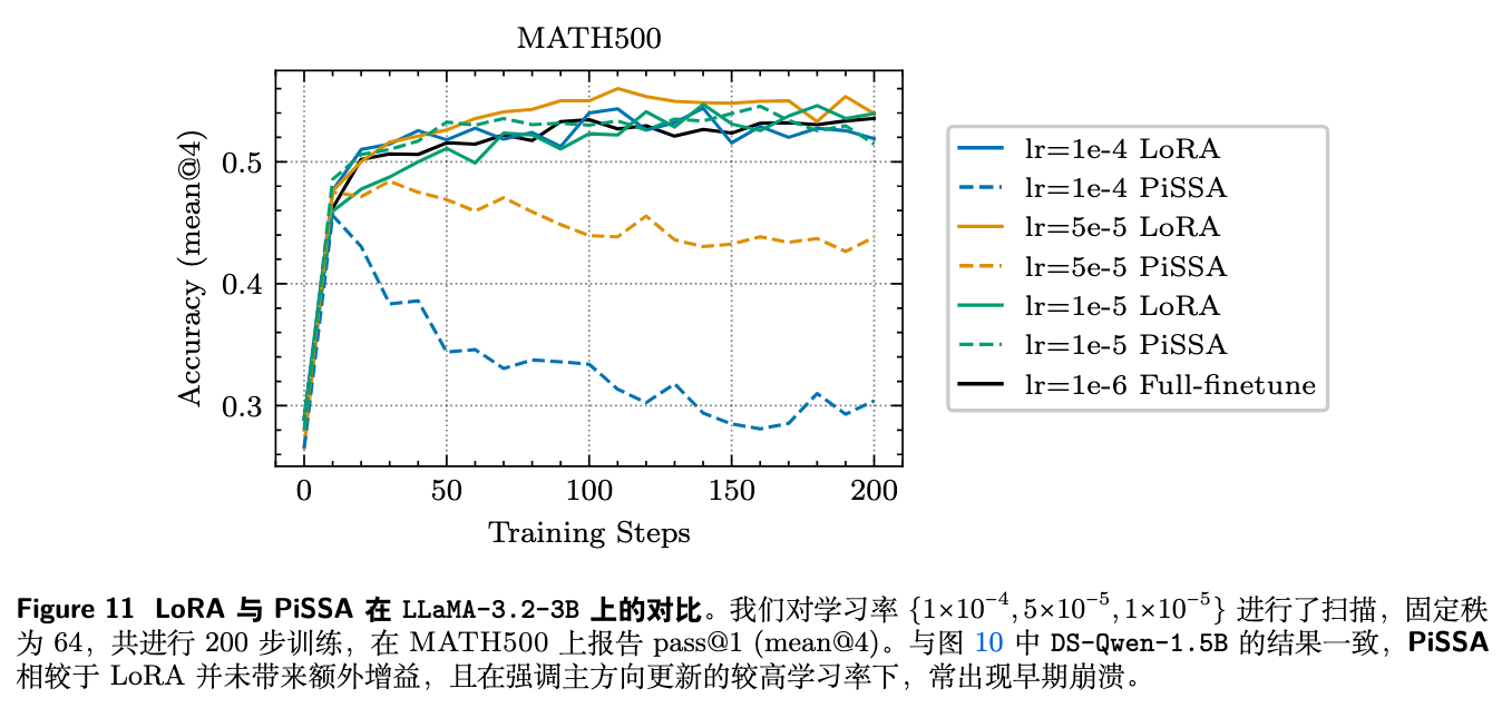实验结果如图 10 和图 11 所示,在所有配置下,PiSSA 相比标准 LoRA 都没有提供任何明显的增益。更糟糕的是,在需要较高学习率来匹配全参数性能时,PiSSA 往往会变得不稳定,训练过程提前崩溃。这是因为提高学习率会强制更新沿着主方向进行,而这正是 RLVR 倾向于规避的高曲率、谱扭曲方向,从而导致优化过程的脆化。