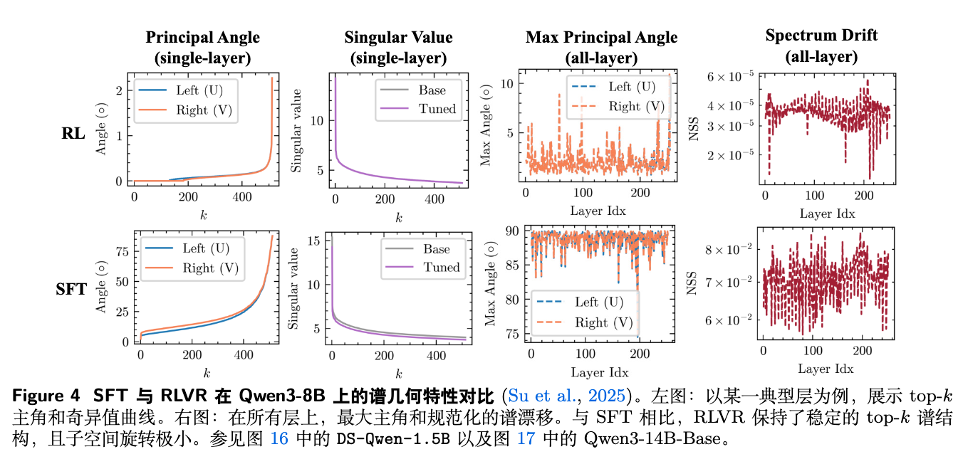 谱结构保持:RLVR 更新应该倾向于保持权重矩阵的奇异值(singular values)和奇异向量子空间(singular subspaces)的稳定。相比之下,SFT 作为一种将模型强行拉向外部数据分布的监督学习方法,则会更剧烈地改变模型的谱结构。 -