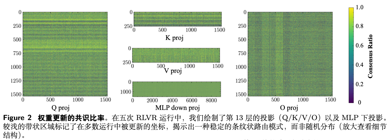 如图 2 所示,共识率高的区域(图中亮带)呈现出清晰的条纹状结构,例如在 Q/K/V 投影中表现为行条纹,在 O 投影中表现为列条纹。这种模式化的、非均匀的分布,进一步证实了更新是沿着模型参数矩阵的特定维度进行的。