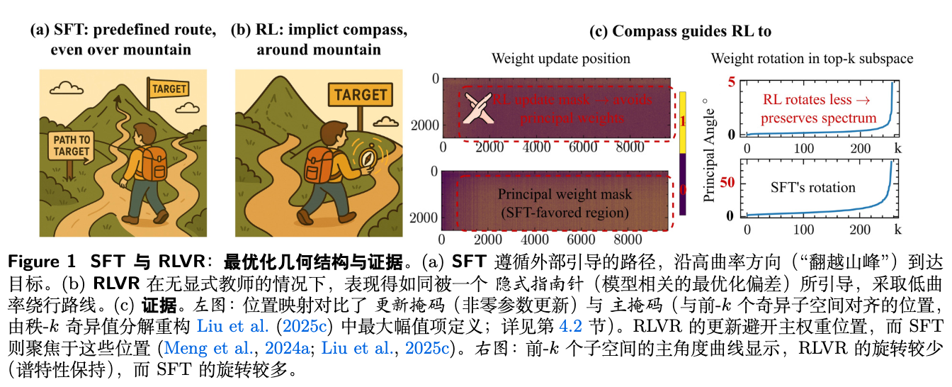 这一发现为“模型几何”门提供了第二个关键证据,并深刻地揭示了 RLVR 和 SFT 在参数空间中的优化动态是截然不同的:SFT 倾向于调整最重要的主权重,而 RLVR 则在其他“非主”区域进行修改。