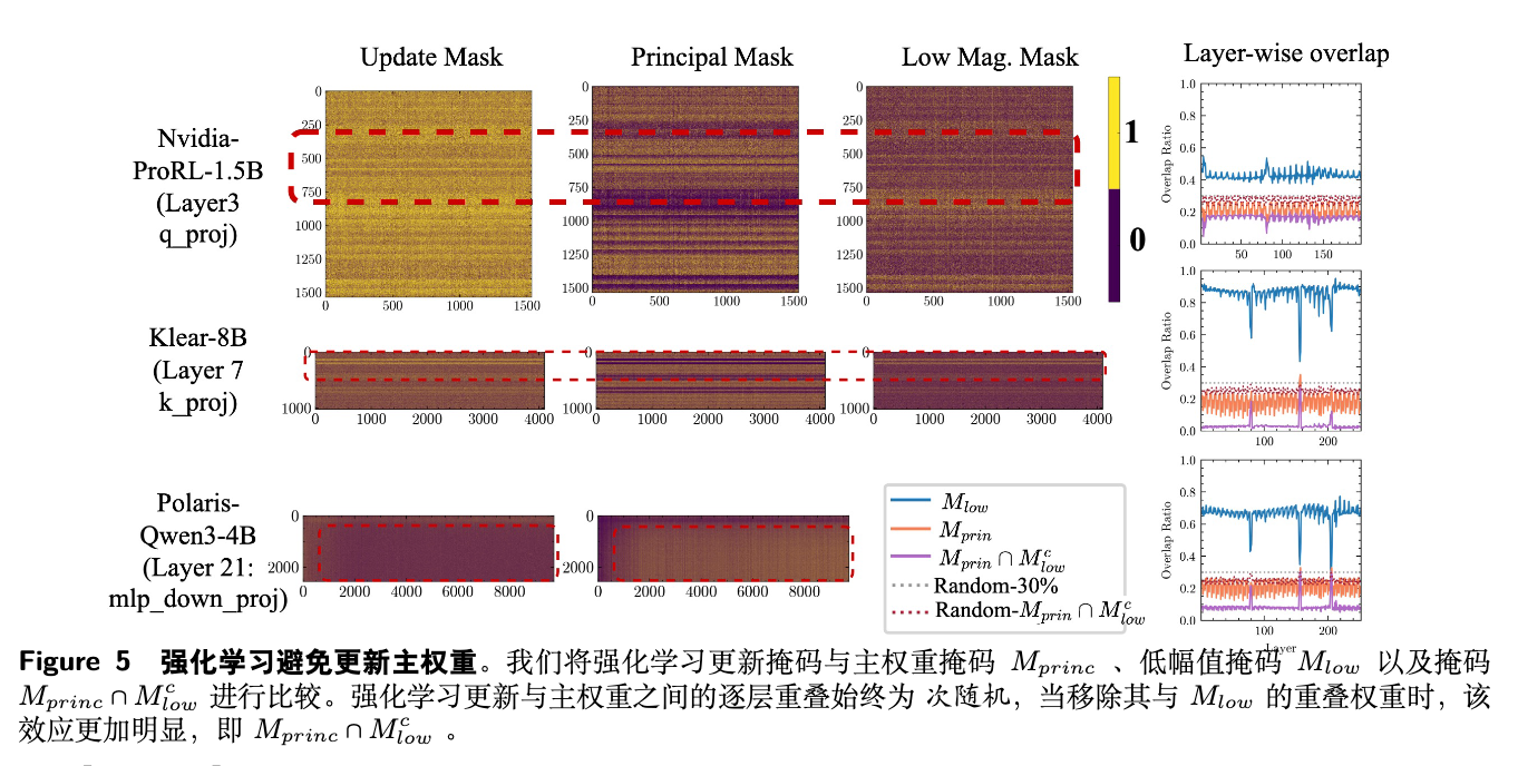 为了回答这个问题,作者对五个在不同数据集上、使用不同 RLVR 算法(GRPO, Reinforcement++, DAPO)训练的 DS-Qwen-1.5B 模型检查点进行了分析。他们首先为每个模型生成一个二值的“变化掩码”(changed mask),标记出所有发生变化的权重位置。随后,他们计算了这些掩码之间的成对杰卡德相似度(Jaccard Overlap)。