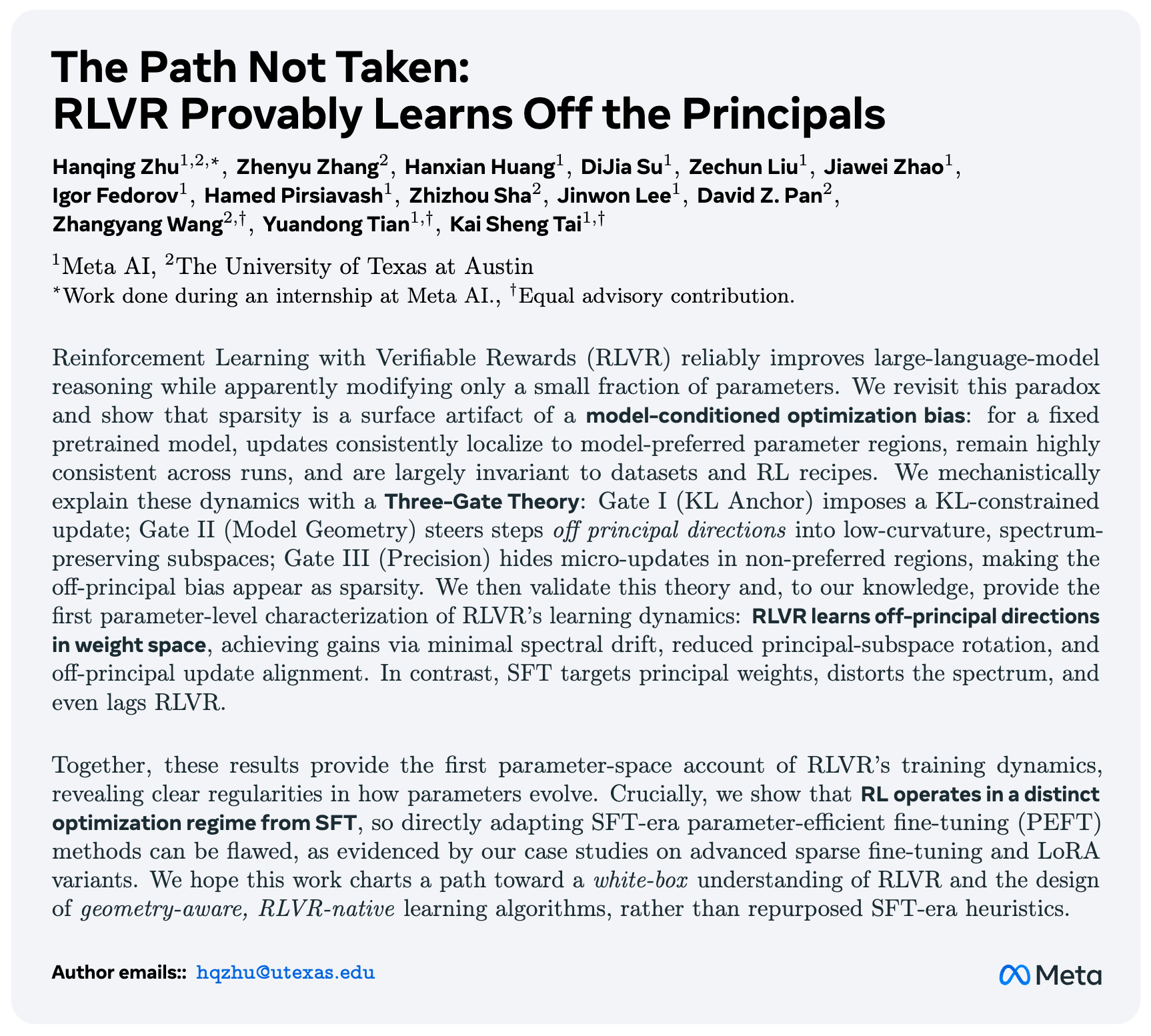 Meta AI 的论文《The Path Not Taken: RLVR Provably Learns Off the Principals》对此进行了系统性的研究。文章揭示了所谓的“稀疏性”仅仅是一个表象,其背后隐藏着一种由预训练模型自身结构决定的、具有持续性的“模型条件优化偏置”(model-conditioned optimization bias)。作者提出了一个名为“三门理论”(Three-Gate Theory)的解释框架,并提供了一系列理论和实验证据来验证该框架。